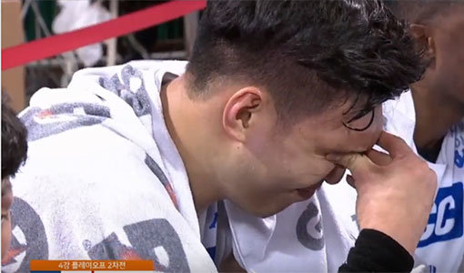 KCC 하승진은 경기 도중 흘린 뜨거운 눈물로 화제를 모았다. 지난달 31일 4강 PO 2차전 막판 팀의 패색이 짙자 분을 참지 못하고 수건에 얼굴을 파묻었다. 모두를 놀라게 한 베테랑의 눈물은 동료들을 일깨웠고, 결국 반격의 발판이 됐다. 사진|MBC 스포츠플러스 캡쳐