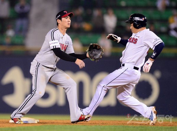3일 서울 잠실야구장에서 ‘2018 신한은행 MY CAR KBO리그’ LG트윈스와 두산베어스 경기가 열렸다. 연장 10회말 2사 1루 상황에서 1루주자 양의지가 2루 도루에 성공하고 있다.