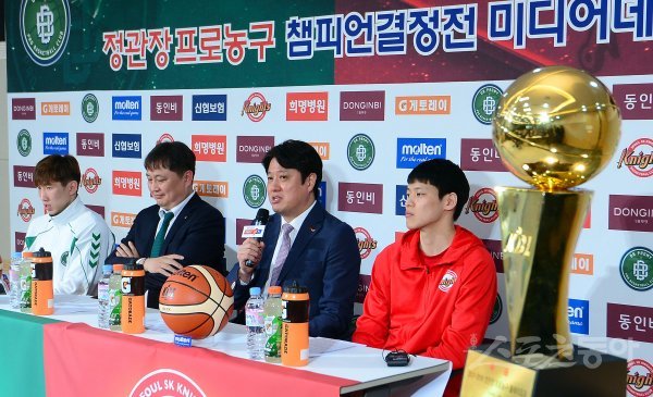5일 서울시 강남구 KBL센터에서 열린 ‘2017-2018 프로농구’ 챔피언결정전 미디어데이 서울SK 문경은 감독이 취재진의 질문에 대답하고 있다.