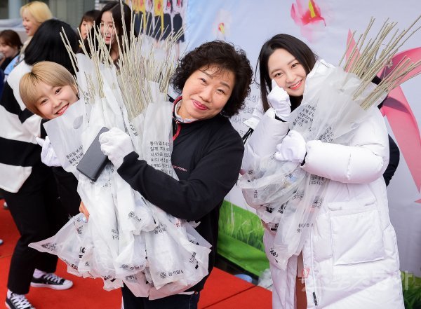 5일 서울 종로구 청계광장에서 식목일 기념 무궁화 나눔 행사가 열렸다. 한 여성 시민이 걸그룹 모모랜드와 함께 무궁화 묘목을 들고 카메라를 보며 포즈를 취하고 있다 .