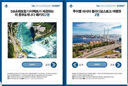 4월 한 달간 진행하는 이번 이벤트에서는 총 25개의 상품이 999명에게 혜택이 돌아간다. 특히 이벤트 상품 중에서 DB손해보험 다이렉트가 제공하는 미국 동부와 캐나다 여행권(2명), 팬스타크루즈 탑승권(4명), 레일유럽의 철도패스(4명), 넷재팬 쓰시마섬(대마도) 캠핑 여행권(4인 가족 2팀) 등 여행상품권이 큰 주목을 받고 있다.