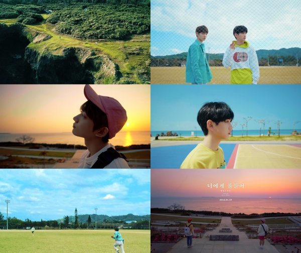 영상 속 안형섭과 이의웅은 무언가를 찾아 헤메이는 듯 청량감이 감도는 바다와 푸른 숲으로 둘러싸인 절벽에서 서로를 향해 힘껏 달려가다 노을지는 언덕 정상에서 서로를 마주본다. 모던한 피아노 선율로 시작해 트로피컬 하우스의 시원한 비트가 돋보이는 ‘너에게 물들어’는 중독성 강한 멜로디와 두 소년의 한층 더 성숙하고 부드러운 목소리로 단번에 귀를 사로잡는다.