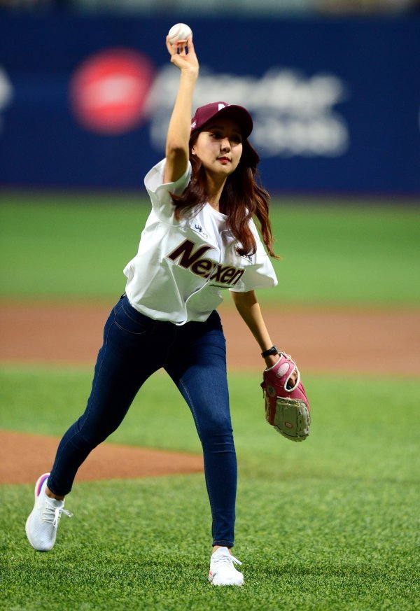 5일 서울 고척스카이돔에서 ‘2018 신한은행 마이카 KBO리그’ 넥센 히어로즈와 kt 위즈의 경기가 열렸다. 박지영 MBC플러스 아나운서가 시구를 던지고 있다.