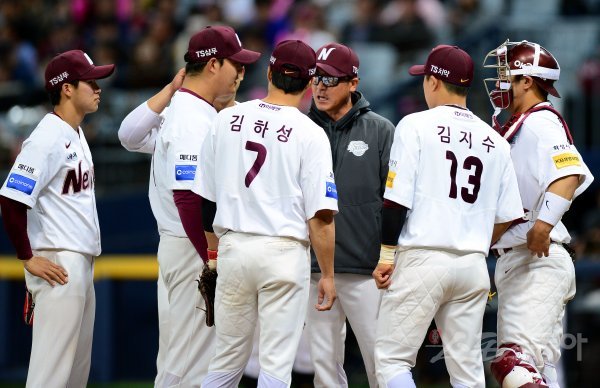 5일 서울 고척스카이돔에서 ‘2018 신한은행 마이카 KBO리그’ 넥센 히어로즈와 kt 위즈의 경기가 열렸다. 9회초 무사 1루에서 대타 kt 강백호 타석 때 마운드에 오른 넥센 장정석 감독이 조상우와 내야수를 모아 이야기를 나누고 있다.