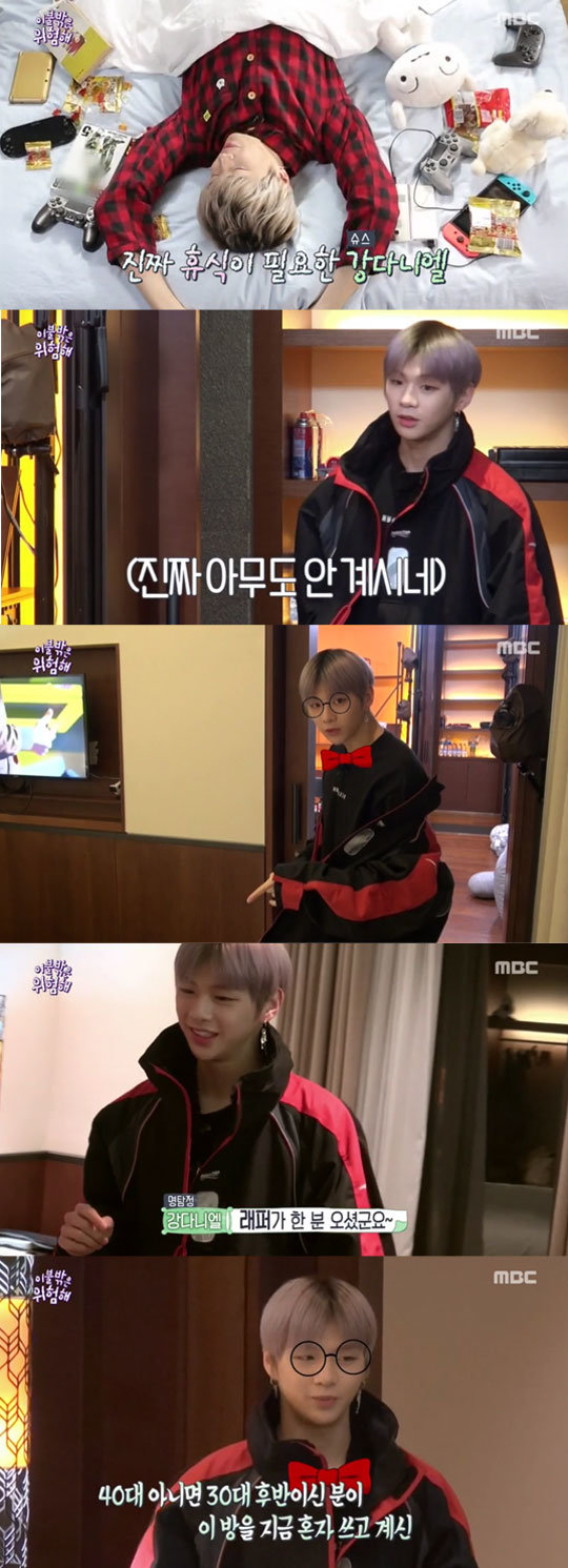 하지만 강다니엘은 어색함 없이 자연스럽게 숙소 구석구석을 물색하며, 빈방 찾기에 나섰다. 그러면서 이미 자리를 잡은 집돌이들을 추적하기에 나섰다. 이필모 자리를 보고는 “우리 또래는 우주폰을 쓰는 사람들이 별로 없다. 아마 40대에서 30대 후반 정도일 것. 연장자일 확률이 높다”, 이이경 자리를 보고는 “대본이 있다. 배우일 것”, 로꼬 짐을 보고 “우와! 래퍼가 한 분 오셨군요”라며 완벽하게 추리해 웃음을 안겼다.