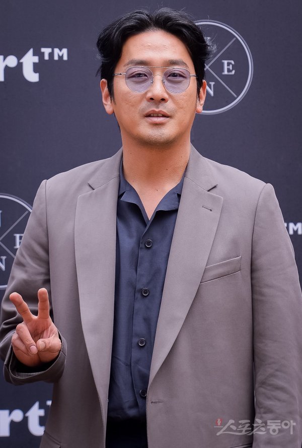 배우 겸 화가 하정우가 6일 서울 중구 장충동 신라호텔 영빈관에서 열린 글로벌 한류 코스메틱 브랜드의 론칭 이벤트 행사에서 포즈를 취하고 있다.