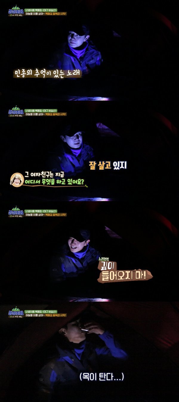 제작진에 따르면 이날 ‘정상회담’ 멤버들은 비슬산 참꽃군락지에서 태어나 처음으로 백패킹을 경험한다. 멤버들은 텐트 안에서 쏟아질 듯한 별빛을 보며 진솔한 토크 타임을 가진다. 각자 떠오르는 사람에게 영상 편지를 보내며 토크 분위기가 무르익을 때쯤, 별을 보던 김민종은 “예전에 사랑했던 사람과의 추억이 생각난다”고 운을 뗐다.