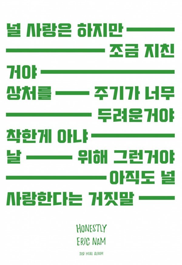 소속사 CJ E&M은 7일 에릭남의 공식 SNS 채널들을 통해 오는 11일 발매 예정인 에릭남의 세 번째 미니앨범 ‘어니스틀리(Honestly)’의 타이틀곡 ‘솔직히 (Honestly...)’의 가사 티저 이미지를 공개했다.