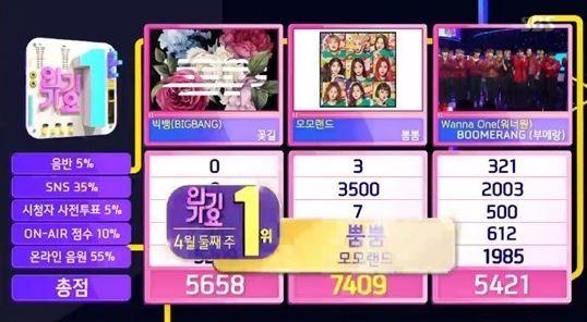 이날 1위 후보에는 빅뱅의 '꽃길', 모모랜드 '뿜뿜', 워너원의 '부메랑'이 올랐고, 집계 결과 모모랜드가 방송 출연 없이 1위에 올랐다.