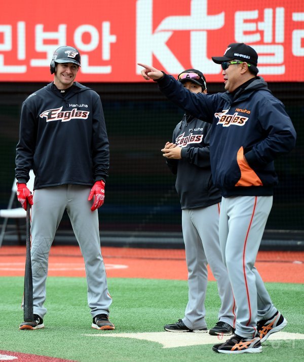 8일 수원 kt위즈파크에서 ‘2018 신한은행 마이카 KBO리그’ kt 위즈와 한화 이글스의 경기가 열린다. 경기 전 한화 장종훈 코치와 호잉이 이야기를 나누고 있다.