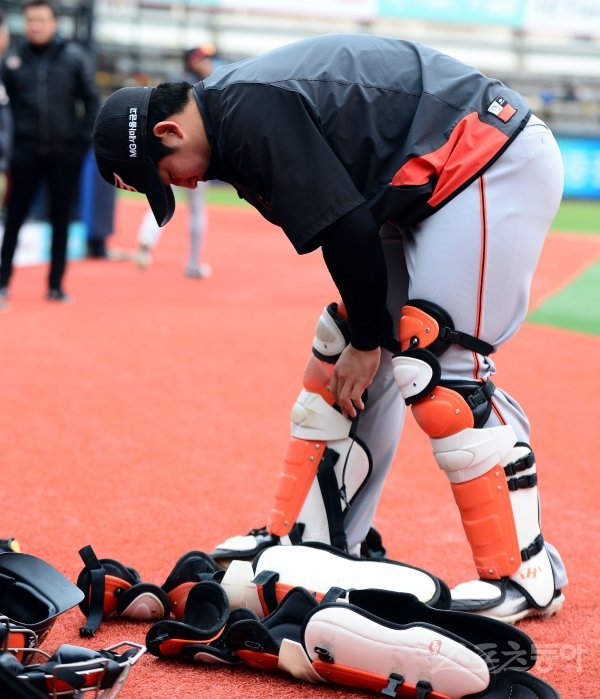 8일 수원 kt위즈파크에서 ‘2018 신한은행 마이카 KBO리그’ kt 위즈와 한화 이글스의 경기가 열린다. 경기 전 한화 최재훈이 포수 장비를 착용하고 있다.