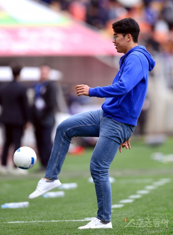8일 수원월드컵경기장에서 열린 프로축구 ‘2018 KEB 하나은행 K리그1(클래식)’ FC서울과 수원삼성 경기 하프타임 때 테니스 선수 정현이 사인볼을 차주고 있다.