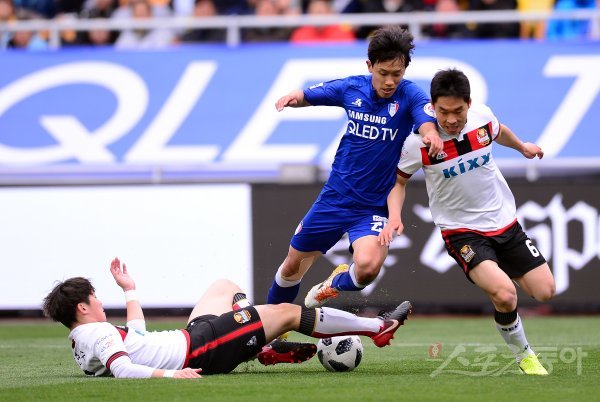 8일 수원월드컵경기장에서 열린 프로축구 ‘2018 KEB 하나은행 K리그1(클래식)’ FC서울과 수원삼성 경기에서 수원 최성근이 서울의 수비를 뚫고 공격하고 있다.