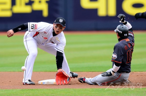 8일 수원 kt위즈파크에서 ‘2018 신한은행 마이카 KBO리그’ kt 위즈와 한화 이글스의 경기가 열렸다. 1회초 무사 1루에서 한화 정근우 타석 때 1루 주자 이용규가 2루 도루를 시도했으나 비디오판독 후 아웃되고 있다.