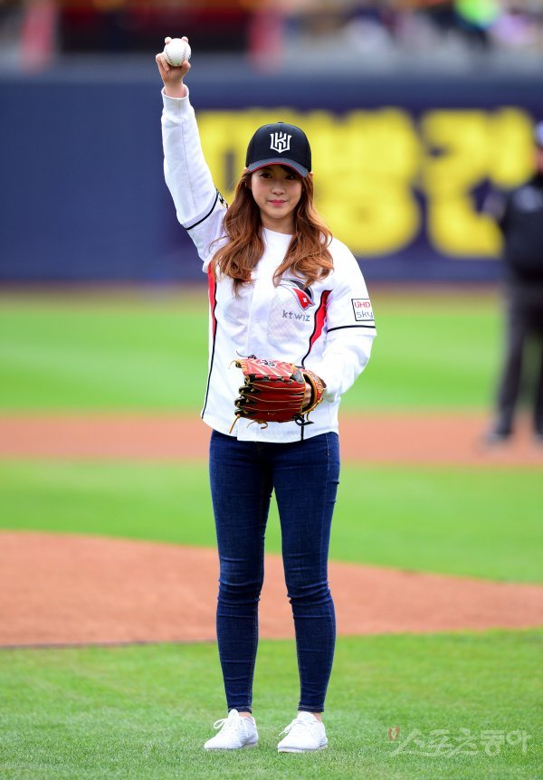 8일 수원 kt위즈파크에서 ‘2018 신한은행 마이카 KBO리그’ kt 위즈와 한화 이글스의 경기가 열렸다. 경기에 앞서 개그우먼 김승혜가 시구를 던지고 있다.