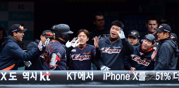 8일 수원 kt위즈파크에서 ‘2018 신한은행 마이카 KBO리그’ kt 위즈와 한화 이글스의 경기가 열렸다. 4회초 2사 1, 2루에서 한화 이성열이 kt 선발 고영표를 상대로 좌월 3점 홈런을 쏘아 올린 뒤 동료들의 환영을 받고 있다.