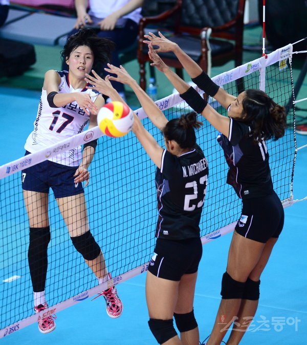 지난해 6월 태국 방콕에서 열렸던 ‘한국- 태국 여자배구 올스타 슈퍼매치 2018’이 8일 경기도 화성종합경기타운 실내체육관에서 열렸다. 한국 이재영이 태국의 블로킹을 앞에 두고 스파이크 공격을 하고 있다.