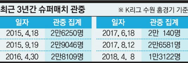 한 때 슈퍼매치는 3~5만 구름 관중을 불러들이는 K리그 최고의 흥행보증수표로 통했다. 그러나 이제는 잠시 잊어도 좋을 듯 하다. 8일 수원벌에는 1만3122명이 찾아왔다. 역대 슈퍼매치 사상 최저 관중. 홈 팀 수원은 늘 대형통천으로 가려놓았던 경기장 2층 스탠드를 개방하며 조심스레 ‘만원관중’을 기대했으나 현실은 냉혹했다. 1차 목표로 삼은 3만 명의 절반에도 미치지 못했다. 미세먼지와 갑작스런 추위 등 저조한 팬 몰이의 이유에는 여러 가지가 있겠지만 무엇보다 맥 빠진 경기력과 기대치를 훨씬 밑도는 결과를 빼 놓을 수 없다. 날씨보다도 두 팀의 저조한 경기력을 팬들이 사전에 간파한 것이다. “최대한 많은 관중 앞에서 결전을 치르고 싶다”고 입을 모았던 수원 서정원 감독과 서울 황선홍 감독은 경기 후 나란히 “죄송하다”며 고개를 숙였다.