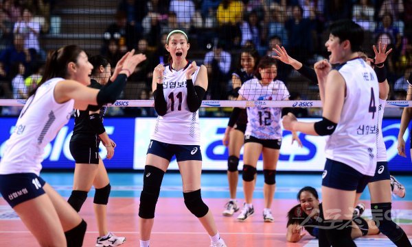 지난해 6월 태국 방콕에서 열렸던 ‘한국- 태국 여자배구 올스타 슈퍼매치 2018’이 8일 경기도 화성종합경기타운 실내체육관에서 열렸다. 한국 김희진이 서브 득점에 성공하자 김수지가 놀라고 있다.