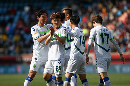 전북현대 손준호(왼쪽 두번째)가 8일 포항스틸야드에서 열린 ‘KEB하나은행 K리그1 2018’ 포항스틸러스와의 5라운드 원정경기에서 골을 터뜨린 뒤 박수를 치며 자축하고 있다. 사진제공 | 한국프로축구연맹
