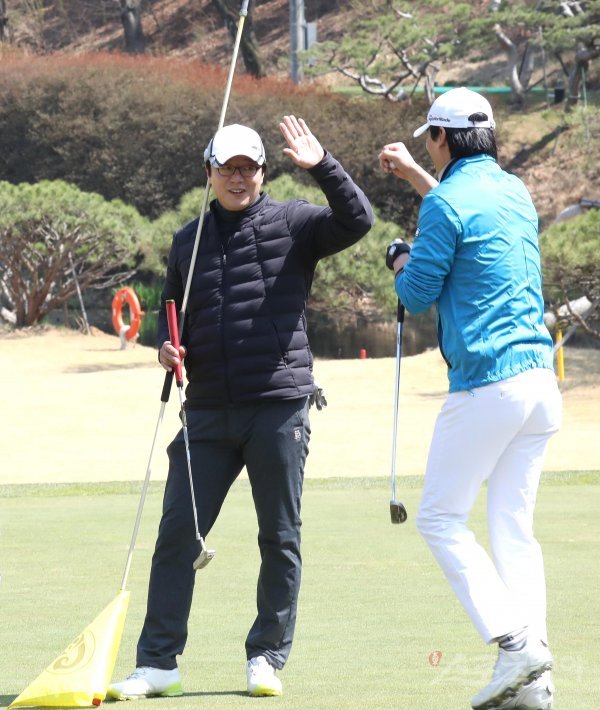 대한축구협회, 한국프로축구연맹, 전북 현대, 울산 현대가 주최하고 스포츠동아, 스포츠경향, 스포츠서울, 스포츠월드, 스포츠조선, 일간스포츠 등 스포츠전문 미디어 6개사가 후원하는 ‘2018년 축구인 골프대회’가 4월 9일 경기도 용인 골드 CC에서 열렸다. 올해로 5회째를 맞은 골프대회에 참석한 황선홍 전 서울FC감독과 최진철 프로축구연맹 경기위원장이 하이파이브 하고 있다.