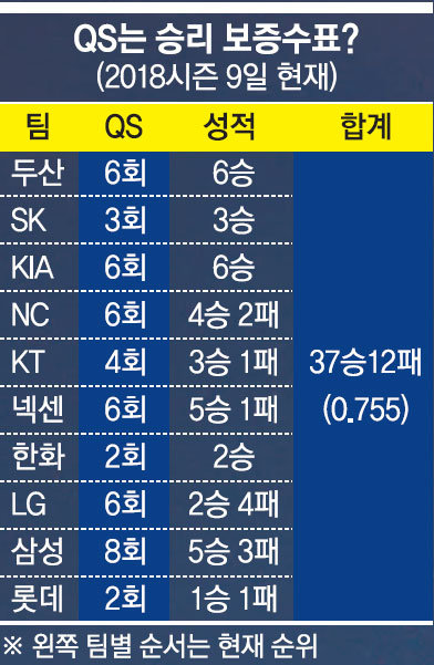 9일까지 프로야구 ‘2018 신한은행 MY CAR KBO리그’에서 10개 구단은 총 64게임을 치렀고, 이 중 선발투수가 QS를 기록한 경기는 49게임이다. 이때 승률은 0.755(37승 12패)에 달한다. 2017시즌에는 총 720경기에서 573회 QS가 나왔고, 승률은 0.714(401승161패11무)였다. QS가 승리를 보장하진 않지만, 적어도 승리 확률은 높였다는 의미다.