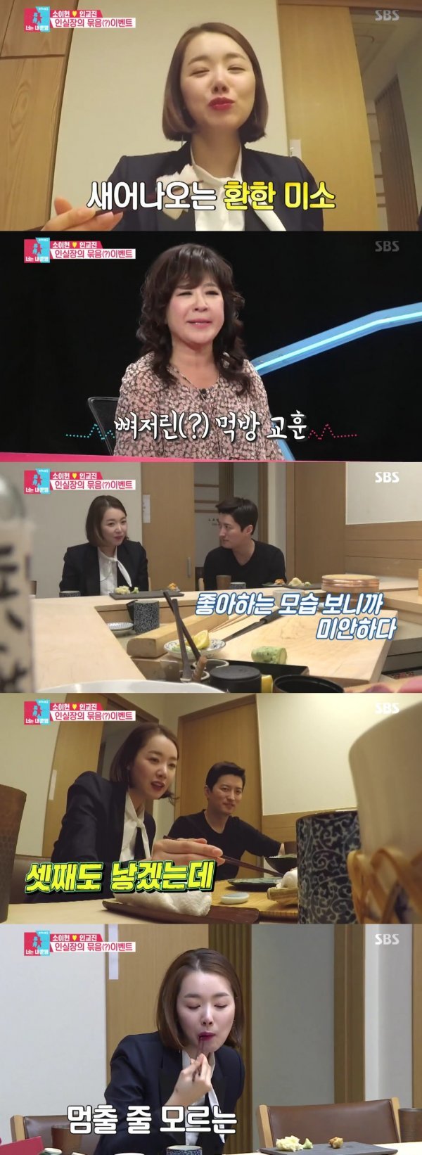 소이현은 “진짜 맛있다. 어떡해”라고 말하며 애교를 보였다. 이에 인교진은 “자기가 이렇게 좋아하는 모습을 보니 미안하다”라고 말했다.