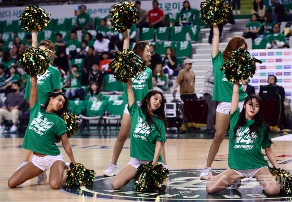 10일 강원도 원주 치악체육관에서 열린 ‘2017-2018 정관장 프로농구’ 원주 DB와 서울 SK의 챔피언결정전 2차전 경기에서 DB 치어리더가 화려한 공연을 선보이고 있다.