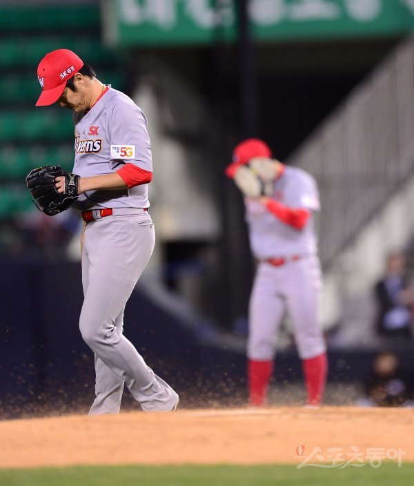 10일 서울 잠실야구장에서 ‘2018 신한은행 MY CAR KBO리그’ SK와이번스와 LG트윈스 경기가 열렸다. 강풍으로 SK 박종훈이 투구를 잠시 멈추고 있다.