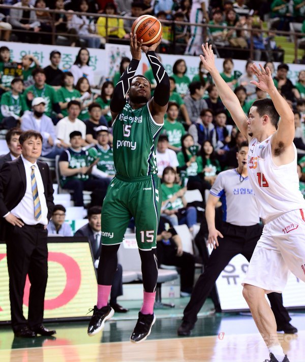 10일 강원도 원주 치악체육관에서 열린 ‘2017-2018 정관장 프로농구’ 원주 DB와 서울 SK의 챔피언결정전 2차전 경기에서 DB 버튼이 이상범 감독 앞에서 3점슛을 쏘고 있다.