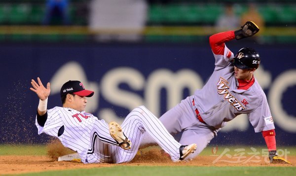 10일 서울 잠실야구장에서 ‘2018 신한은행 MY CAR KBO리그’ SK와이번스와 LG트윈스 경기가 열렸다. 4회초 무사 1루 상황에서 1루주자 SK 최항이 2루 도루를 시도했으나 LG 강승호에게 태그 아웃되고 있다.