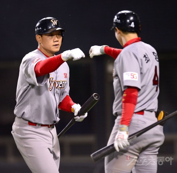 10일 서울 잠실야구장에서 ‘2018 신한은행 MY CAR KBO리그’ SK와이번스와 LG트윈스 경기가 열렸다. 5회초 1사 1루 SK 최승준이 좌월 투런 홈런을 날리고 그라운드를 돌아 홈인해 최항의 축하를 받고 있다.