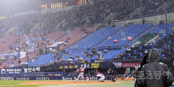 10일 서울 잠실야구장에서 열린 ‘2018 신한은행 MY CAR KBO리그’ SK와이번스와 LG트윈스 경기가 강풍과 우천에도 진행되고 있다.