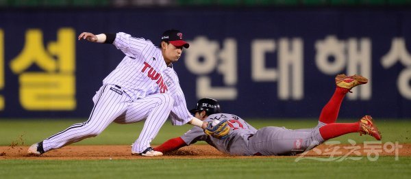 10일 서울 잠실야구장에서 ‘2018 신한은행 MY CAR KBO리그’ SK와이번스와 LG트윈스 경기가 열렸다. 8회초 1사 1루 상황에서 1루주자 SK 노수광이 2루 도루에 성공하고 있다.