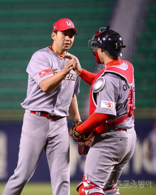 10일 서울 잠실야구장에서 ‘2018 신한은행 MY CAR KBO리그’ SK와이번스와 LG트윈스 경기가 열렸다. 9회말 2사 1,2루 LG 김용의를 삼진 아웃시키며 세이브를 따낸 SK 윤희상이 기뻐하고 있다.