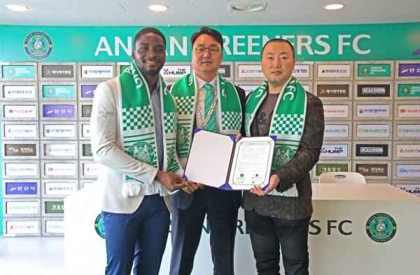 이날 협약식에는 안산의 박공원 단장을 비롯해 FC WORLD의 윤초원 부단장 그리고 가나 출신 방송인 샘 오취리가 참석했다.