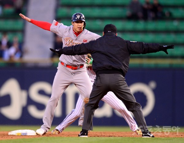 11일 서울 잠실야구장에서 ‘2018 신한은행 MY CAR KBO리그’ SK와이번스와 LG트윈스 경기가 열렸다. 2회초 무사 1루 SK 한동민 내야 땅볼 때 1루주자 김동엽이 2루에서 세이프 판정을 받았다. 하지만 비디오판독 결과 아웃.