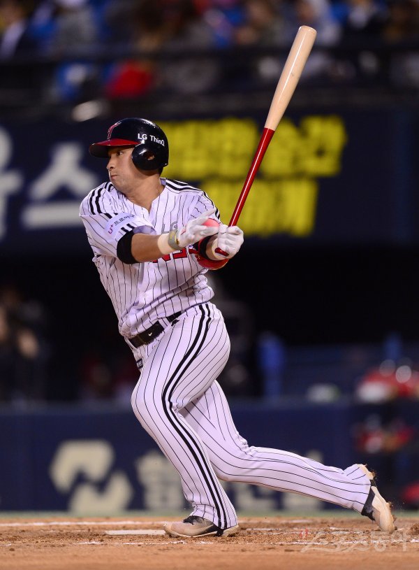 11일 서울 잠실야구장에서 ‘2018 신한은행 MY CAR KBO리그’ SK와이번스와 LG트윈스 경기가 열렸다. 3회말 무사 LG 강승호가 좌전 안타를 치고 있다.