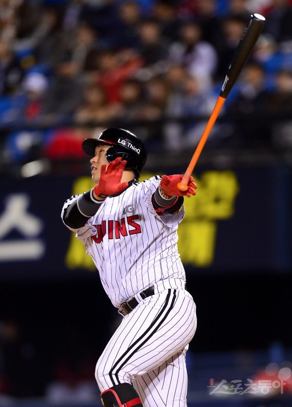 11일 서울 잠실야구장에서 ‘2018 신한은행 MY CAR KBO리그’ SK와이번스와 LG트윈스 경기가 열렸다. 4회말 2사 LG 유강남이 좌중월 솔로 홈런을 날리고 있다.