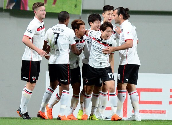 11일 서울 월드컵경기장에서 열린 ‘KEB하나은행 K리그1 2018’ FC 서울과 포항 스틸러스의 경기에서 포항 김승대가 골을 성공한 뒤 동료들과 기쁨을 나누고 있다.