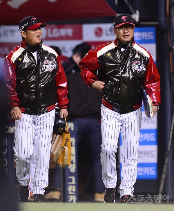 11일 서울 잠실야구장에서 ‘2018 신한은행 MY CAR KBO리그’ SK와이번스와 LG트윈스 경기가 열렸다. LG 류중일 감독과 유지현 코치가 밝은 표정으로 경기장을 빠져나가고 있다.
