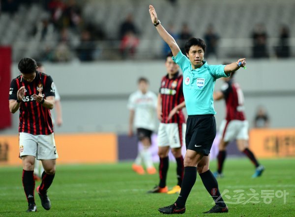 11일 서울 월드컵경기장에서 열린 ‘KEB하나은행 K리그1 2018’ FC 서울과 포항 스틸러스의 경기에서 심판이 포항 제테르손의 골에 대해 비디오판독 결과 오프사이드를 선언하고 있다.
