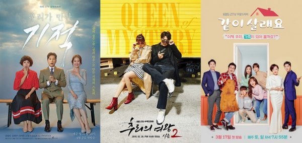 한편 ‘우리가 만난 기적’은 매주 월화 밤 10시, ‘추리의 여왕 시즌2’는 매주 수목 밤 10시, ‘같이 살래요’는 매주 토일 저녁 7시 55분에 KBS 2TV에서 방송된다.