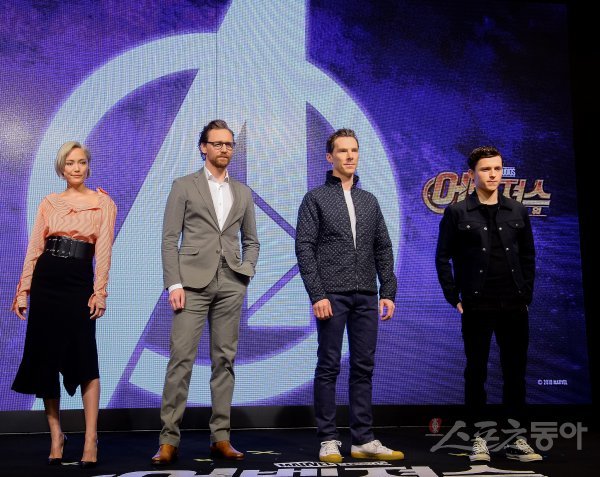 배우 폼 클레멘티에프, 톰 히들스턴, 베네딕트 컴버배치, 톰 홀랜드(왼쪽부터)가 12일 서울 종로구 포시즌스호텔에서 열린 영화 ‘어벤져스 : 인피니티 워(Avengers: Infinity War)’ 내한 기자회견에서 포즈를 취하고 있다.