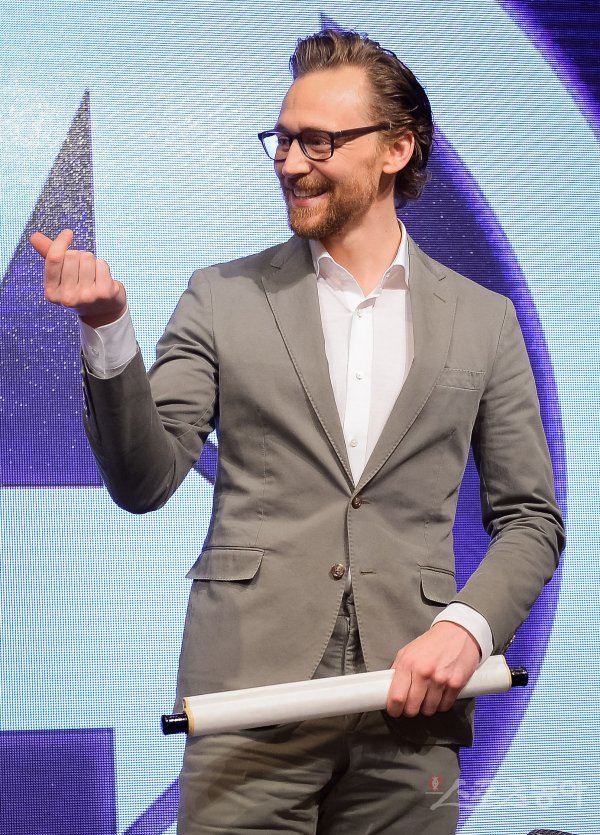 배우 톰 히들스턴이 12일 서울 종로구 포시즌스호텔에서 열린 영화 ‘어벤져스 : 인피니티 워(Avengers: Infinity War)’ 내한 기자회견에서 손가락 하트를 하고 있다.