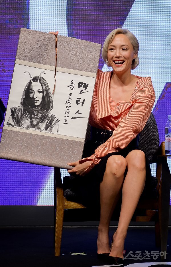 배우 폼 클레멘티에프가 12일 서울 종로구 포시즌스호텔에서 열린 영화 ‘어벤져스 : 인피니티 워(Avengers: Infinity War)’ 내한 기자회견에서 선물을 받은 후 미소를 짓고 있다.