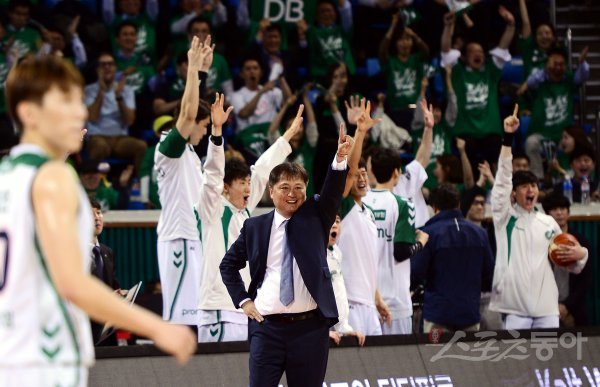 12일 서울 잠실학생체육관에서 열린 ‘2017-2018 정관장 프로농구’ 서울 SK와 원주 DB의 챔피언결정전 3차전 경기에서 DB 이상범 감독이 선수들의 플레이에 환호하고 있다.
