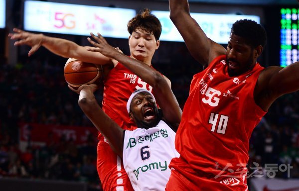 12일 서울 잠실학생체육관에서 열린 ‘2017-2018 정관장 프로농구’ 서울 SK와 원주 DB의 챔피언결정전 3차전 경기에서 DB 벤슨이 슛할 때 SK 안영준이 반칙을 범하고 있다.