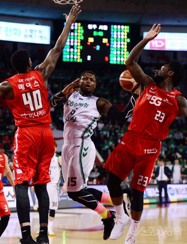 12일 서울 잠실학생체육관에서 열린 ‘2017-2018 정관장 프로농구’ 서울 SK와 원주 DB의 챔피언결정전 3차전 경기에서 DB 버튼이 SK 메이스, 화이트 수비 사이로 돌파하고 있다.