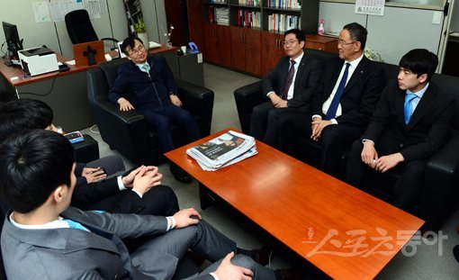 ‘도드람 2017∼2018 V리그’ 남자부 챔피언결정전 우승팀 대한항공 박기원 감독(오른쪽 두 번째)과 박진성 사무국장, 선수들이 12일 우승을 기념해 서울 광화문 스포츠동아를 방문했다.